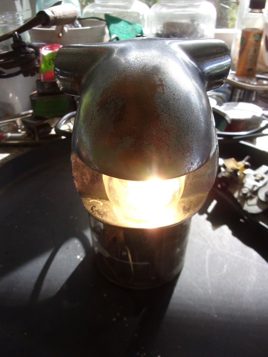 measures about 8-1/2" long, 5" wide, original glass lens and light socket, working, very heavy piece.