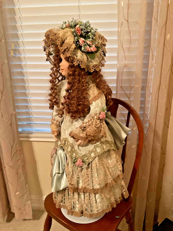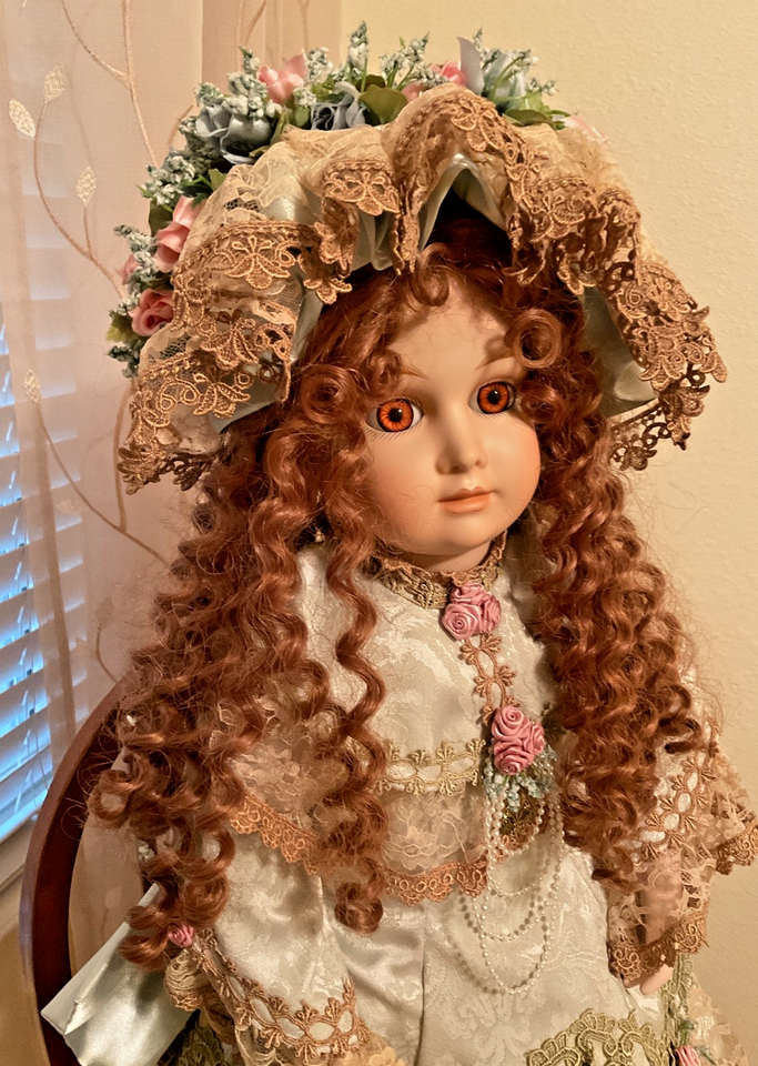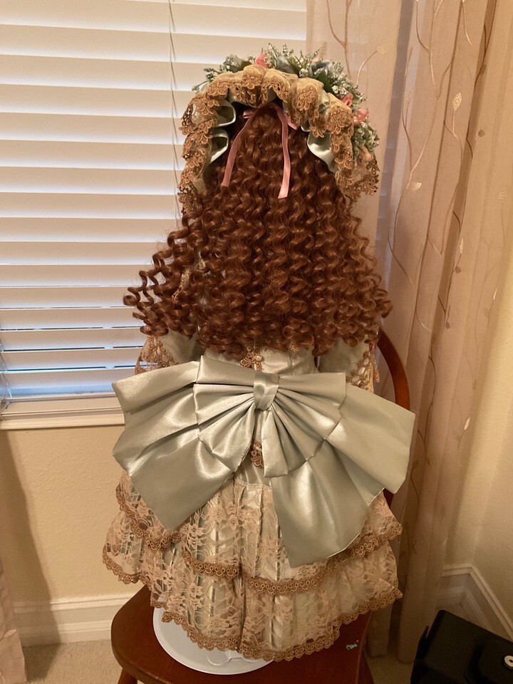 The Patricia Loveless Doll "Tory" is a licensed reproduction porcelain doll with curly brown hair and brown eyes. This personalized doll is 27 inches long and weighs 6 pounds, featuring a light complexion. The set includes the doll itself, making it a unique and beautiful addition to any doll collection.
