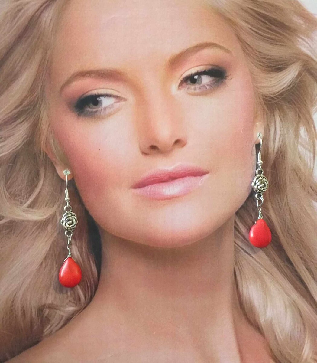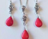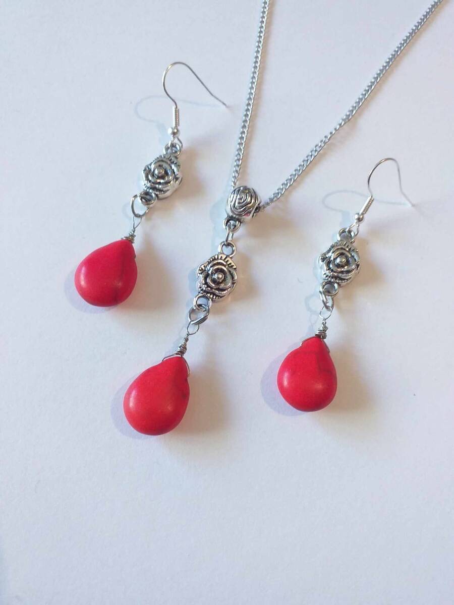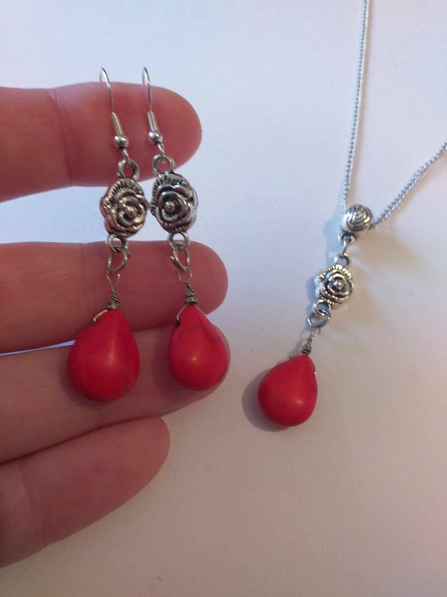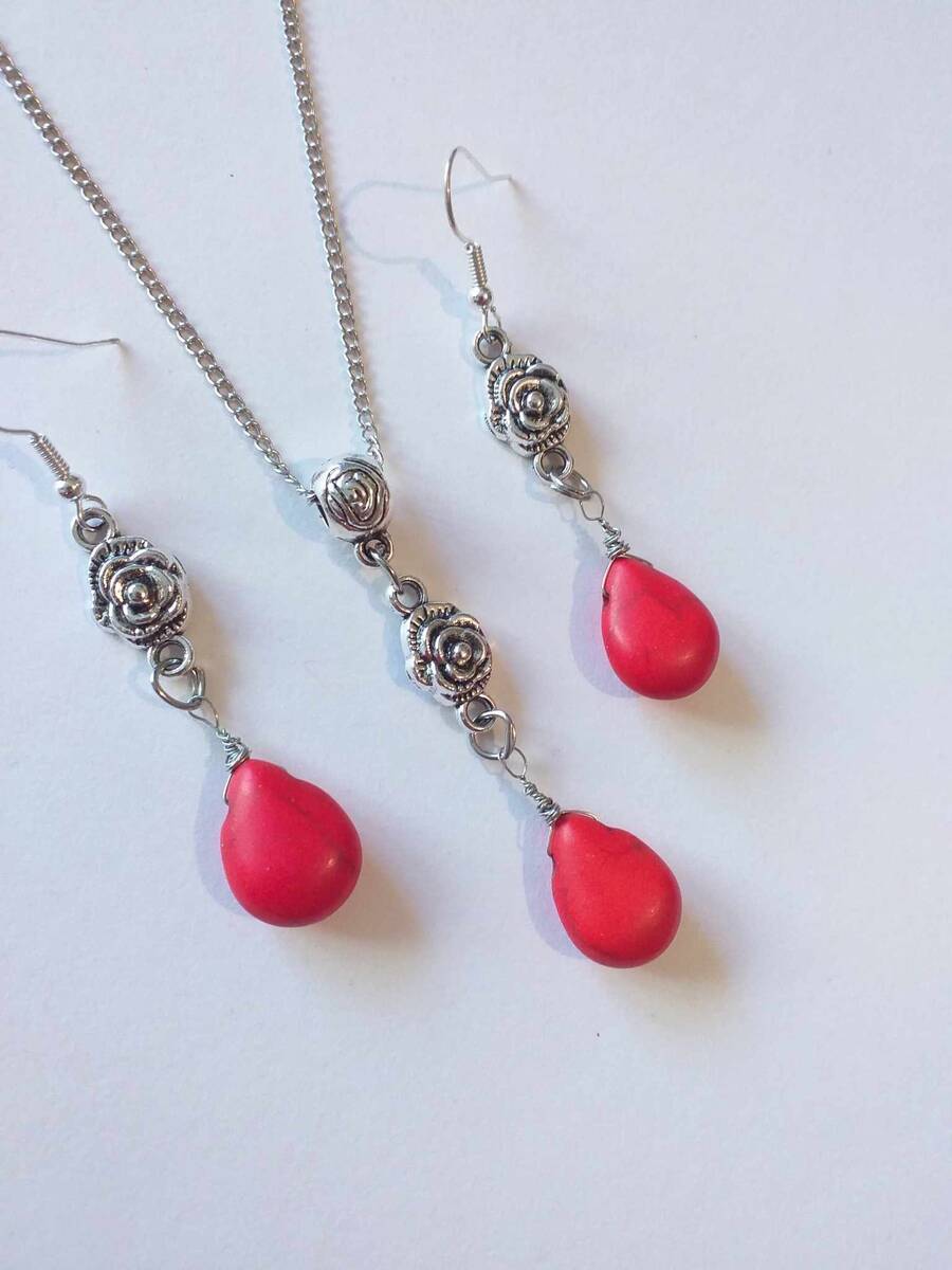 Beautiful Set of silver-tone Antique style red Turquoise necklace and earrings . Silver-tone rose pendant Victorian style necklace and earrings . Boho necklace . Bohemian necklace and earrings . Romantic necklace and earrings . Beautiful necklace with same style earrings with red teardrop shaped Turquoise.