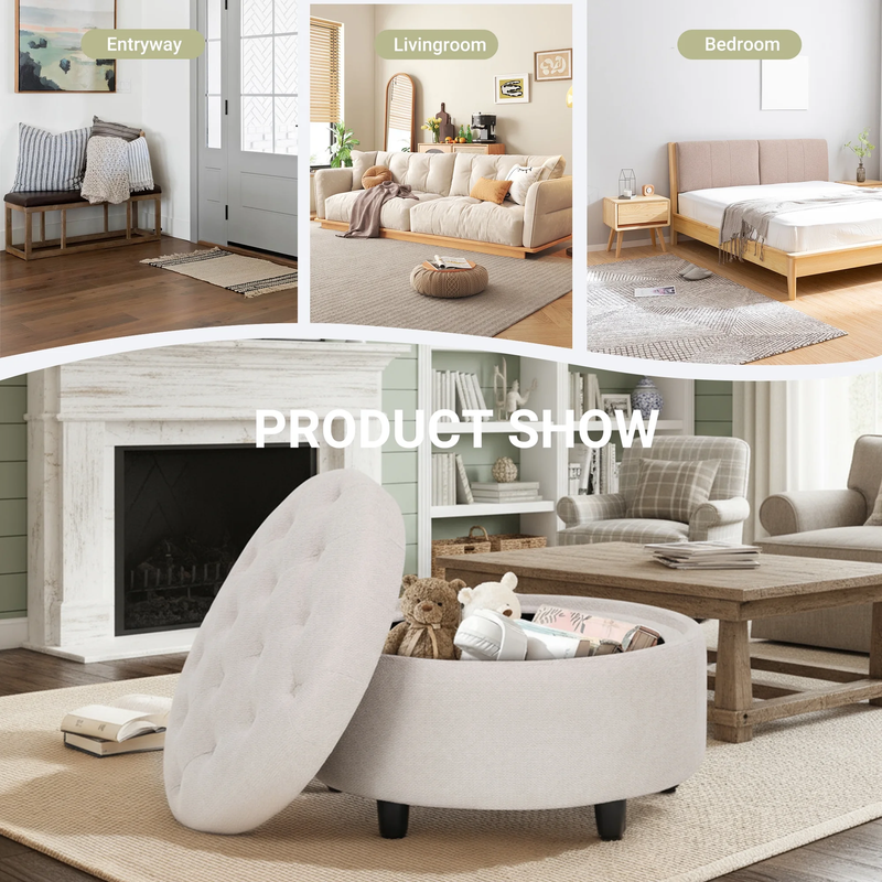 Maximize your space and comfort with our 3-in-1 Round Storage Ottoman. This incredibly versatile piece is designed to simplify and enhance your living area. Use it as a plush footrest to relax after a long day, as a hidden storage bin to effortlessly tidy away blankets, remotes, and magazines, or simply flip the lid to transform it into a sturdy side table for your drinks and snacks. Crafted with a soft, breathable fabric and filled with high-density cushioning, it offers exceptional comfort. Supported by a reinforced frame and a stable base, it boasts a robust 250 lbs weight capacity, ensuring long-lasting durability. This ottoman is the perfect, space-saving solution for a more organized and comfortable home.
