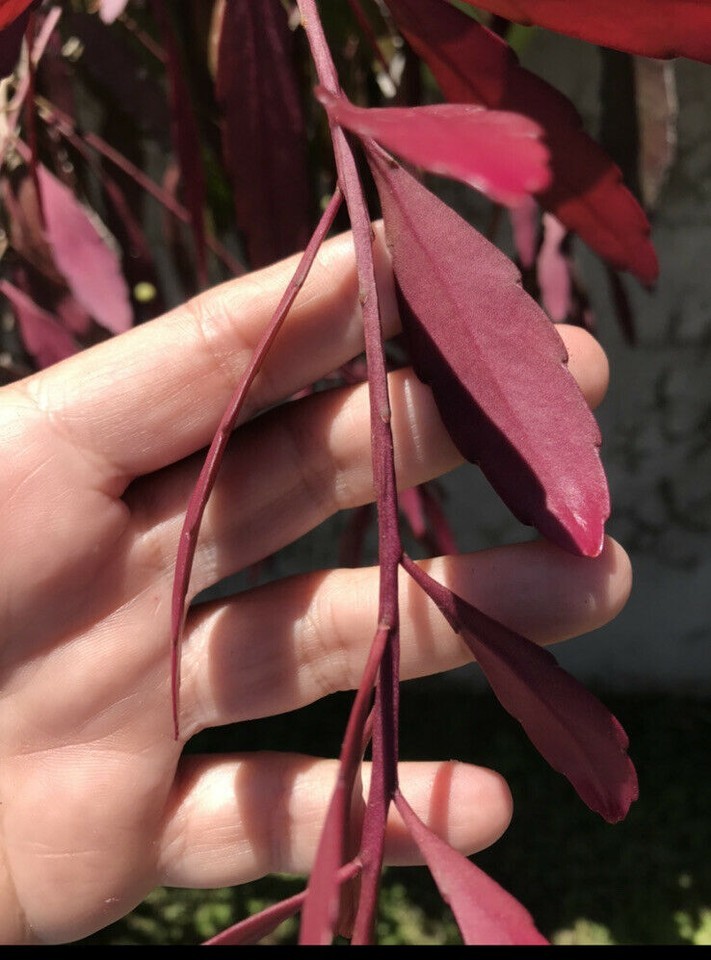 Rhipsalis ramulosa is a shrubby, epiphytic cactus, freely branching basally with pendant, flat, reddish tapeworm stems up to 2.3 feet (70 cm) long, that turn deep violet red in high light. It produces lots of greenish-white or pinkish flowers, up to 0.5 inch (1.2 cm) and up to 0.6 inch (1.5 cm) in diameter, followed by small, ornamental, shell berries lining both edges of the ribbon stems.