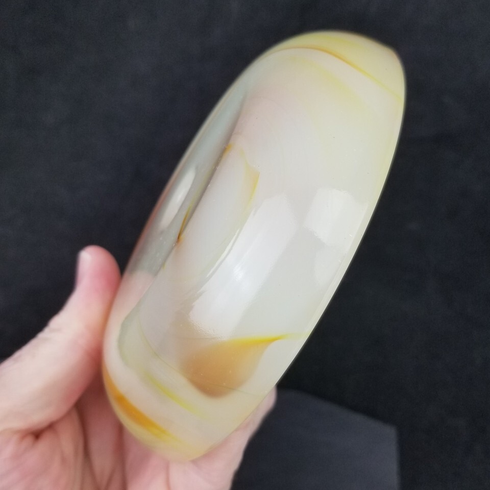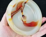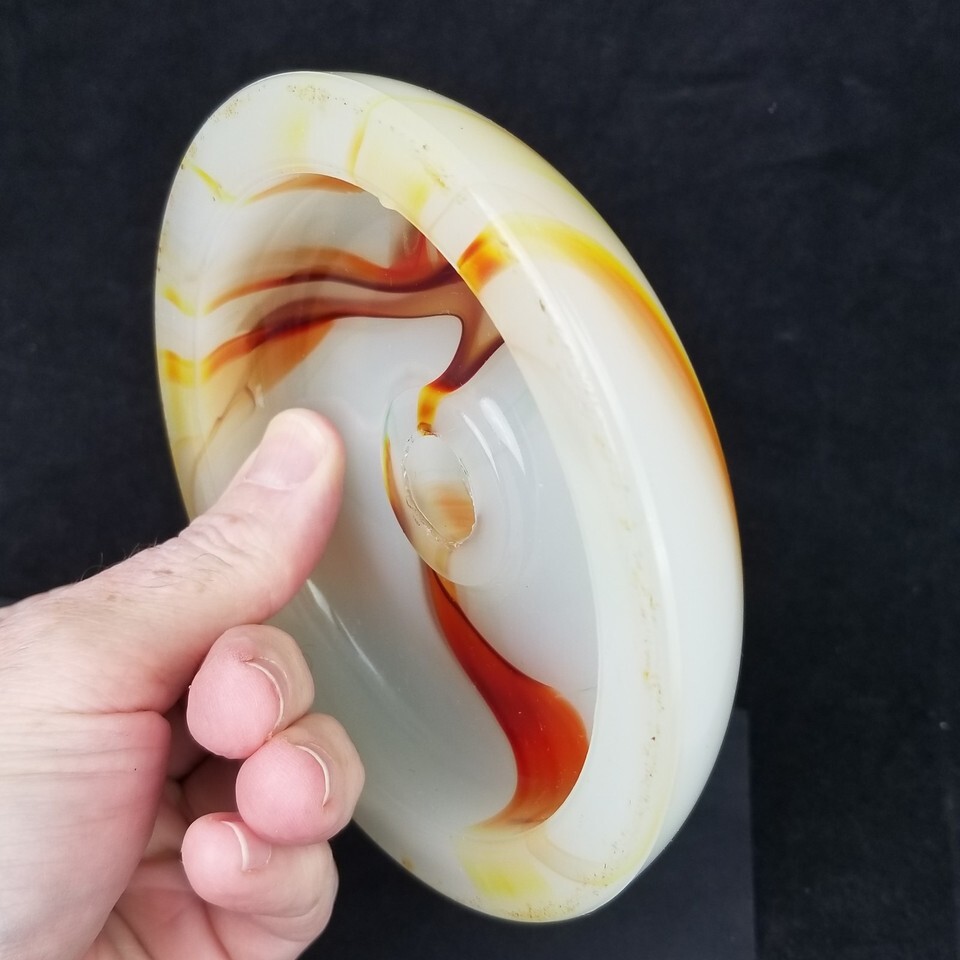 GREAT SHAPE! No cracks or chips. From a smoking stand. This is the dome that would cover the top of the decorative middle metal piece on the neck. White with multiple orange tone marbling. 5" diameter at its widest. 1 1/8" tall. The small hole is 1/2" inside diameter. It will be protected well and insured. Location B1, MER