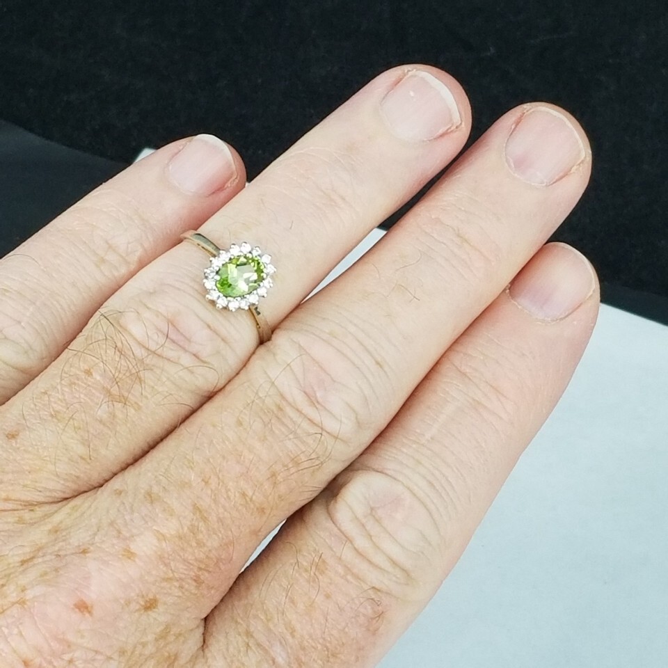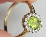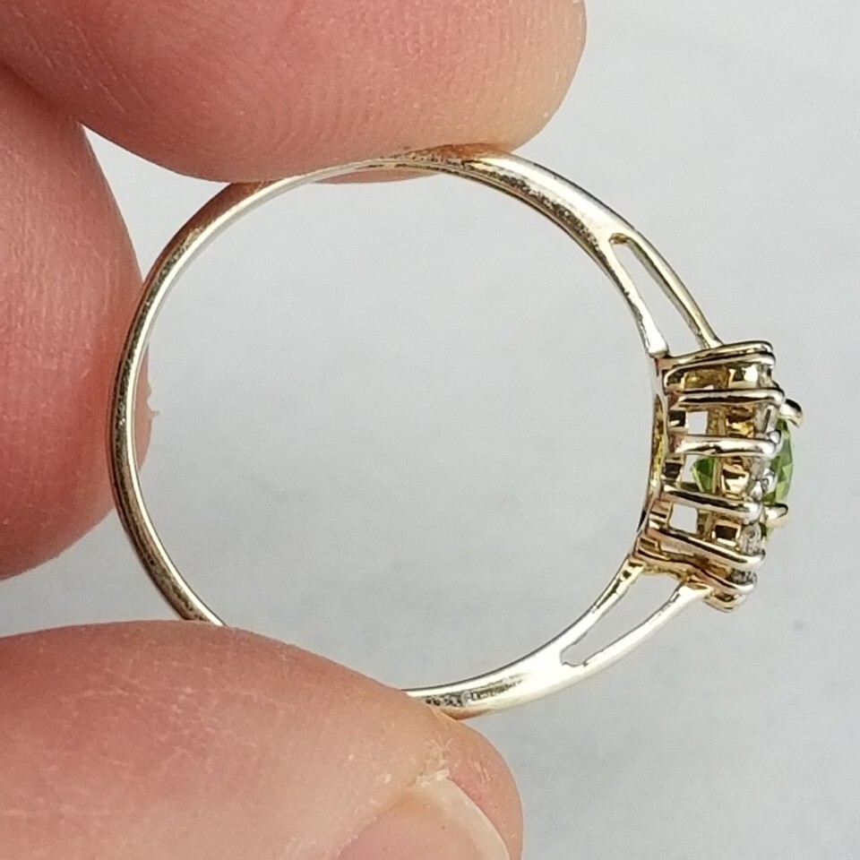 RIGHT FROM AN ESTATE SALE OUT OF LANCASTER OHIO..... Main stone of beautiful peridot encircled with clear cubic zirconia. Sterling silver setting and band with a light gold hue. Looks to be gold over sterling. Marke 925. Size 7. Could use a little polishing to be perfect. It will be protected well and insured. Let me know if you have questions. Location D3E, MER
