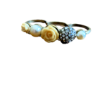 A three-finger ring with a molded rose in the center, cluster of rhinestones and beads on the sides. Two outer rings are a size 8 and the inner one is about 8.5.