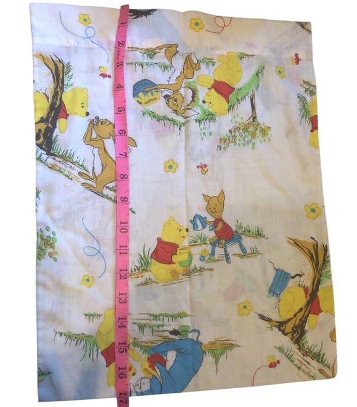 see measurements The Sears Roebuck Perma-Prest Winnie the Pooh toddler crib pillowcase is a nostalgic collectible from the 1970s, featuring Disney fabric with the beloved Winnie the Pooh character. Made in the United States, this vintage piece adds a touch of whimsy to any toddler's crib, perfect for fans of Disney and collectors of Disneyana. With its classic design and high-quality construction, this pillowcase is a charming addition to any child's bedroom.
