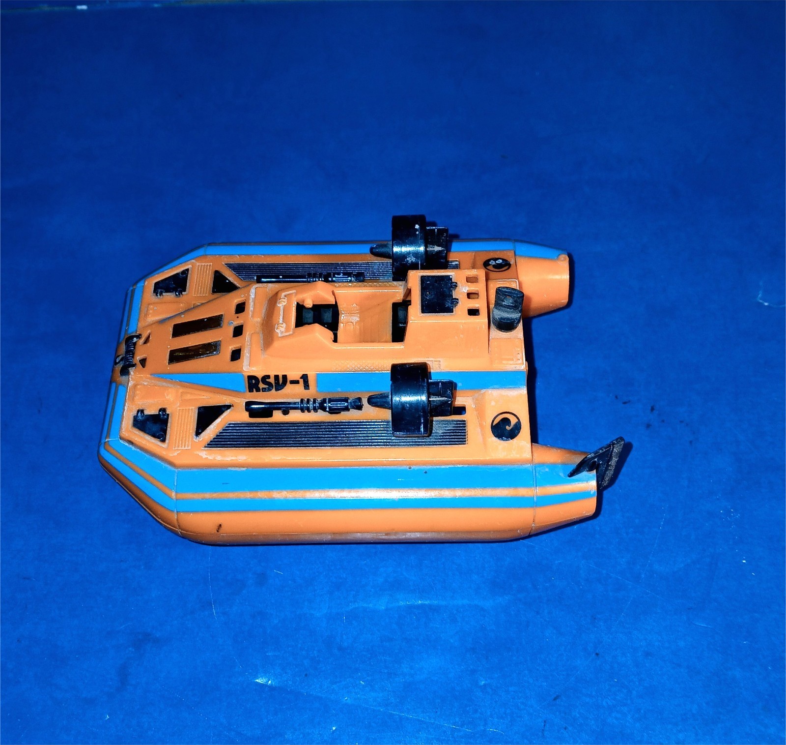 This is a vintage Tyco Stomper Diving Devil - works! Has missing rudder on one side, One of the treads is splitting. But tested and light comes on and wheels turn. Has a slight high pitched noise when operating. Ships fast!