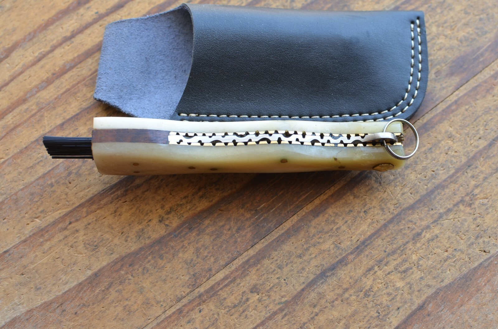 The knife handle is made of camel bone secured with brass liners and brass pins please
